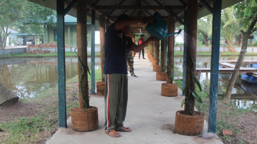 Setelah selesai bekerja bereskan semua alat-alat pada tempatnya dan laksanakan pembersihan sektor Pilot projek ini agar besok pagi kita mulai bekerja langsung bekerja tidak lagi mencari-cari alat,ataupun pembersihan tempat. Karena itu akan menyita waktu kita,dan jangan lupa setiap pagi dan sore tanaman vanili yang sudah ada wajib di siram, " Pungkas Pasi Ter.