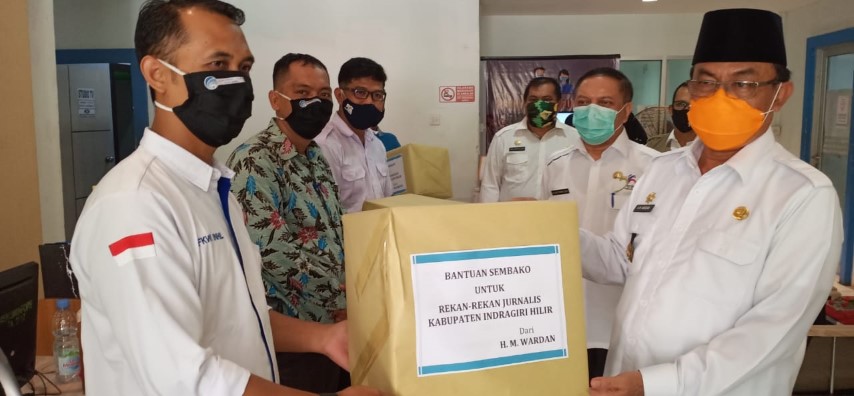 Indragirione.com,- Bupati Kabupaten Indragiri Hilir (Inhil), HM Wardan menyerahkan bantuan sembako bagi para jurnalis yang bertugas meliput di Kabupaten Inhil, Rabu (22/4/2020) di Kantor Diskominfops Inhil, Tembilahan.