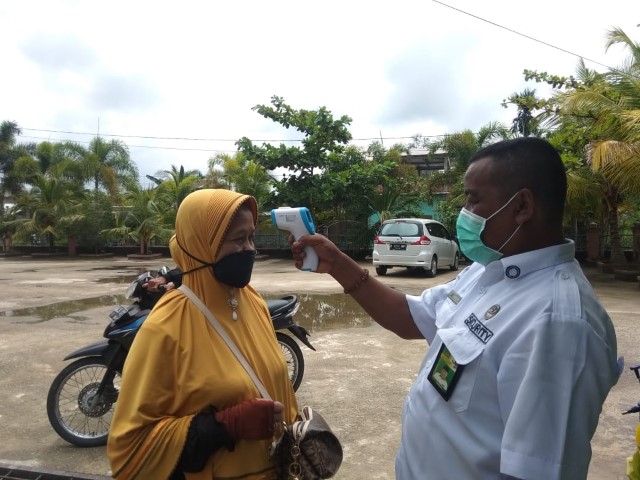 Tampak pada gambar, seorang Petugas Keamanan sedang memeriksa suhu tubuh kepada salah seorang masyarakat yang hendak berurusan di Kantor Kementerian Agama Kabupaten Indragiri Hilir. (Utar)