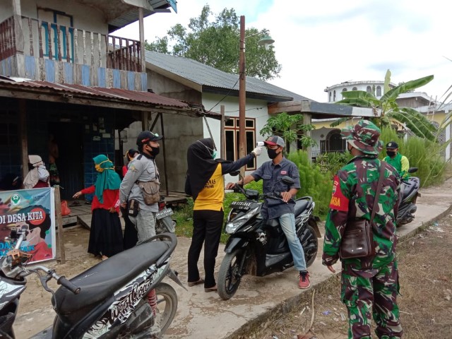 Babinsa Koramil 12/Batang Tuaka Bersama Instansi Terkait Cek Suhu Tubuh Warga Tasikraya