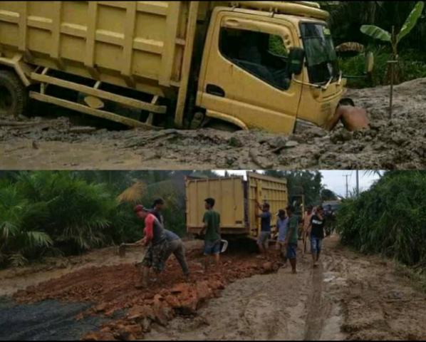 Penimbunan jalan tersebut didanai dari swasembada masyarakat dan pengusaha (toke) kelapa sawit setempat. Dengan semangat bergotong royong masyarakat melakukan penimbunan jalan yang rusak parah seperti bubur.