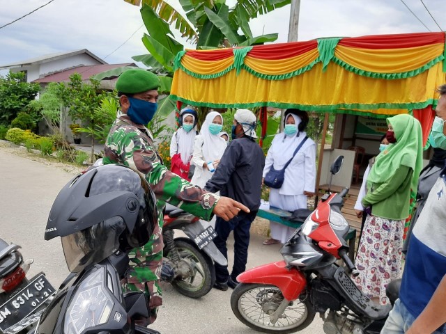Koramil 12/Batang Tuaka Lakukan Pengecekan Suhu Tubuh di Perbatasan Desa Gemilang Jaya