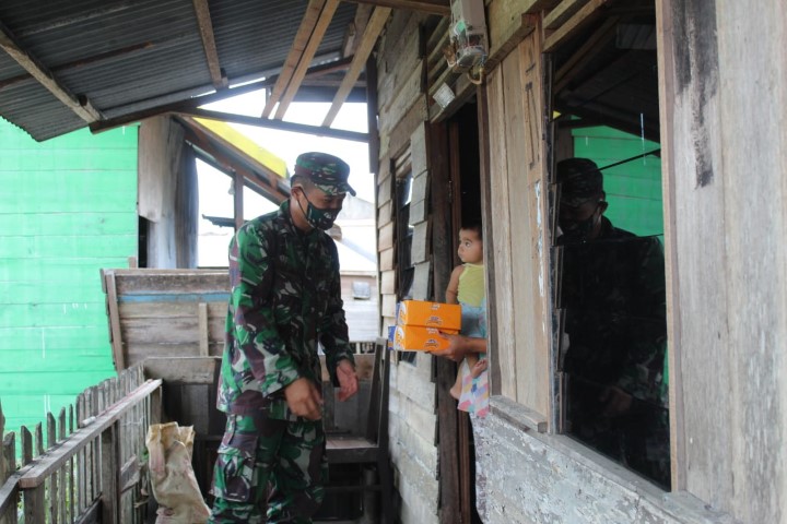 Babinsa dan para personil Kodim 0314/Inhil mendatangi rumah ke rumah warga dan memberikan bantuan nasi kotak yang ditujukan untuk penduduk yang terdampak Covid-19 dan sebagai sarana berbagi di hari jumat yang penuh berkah.