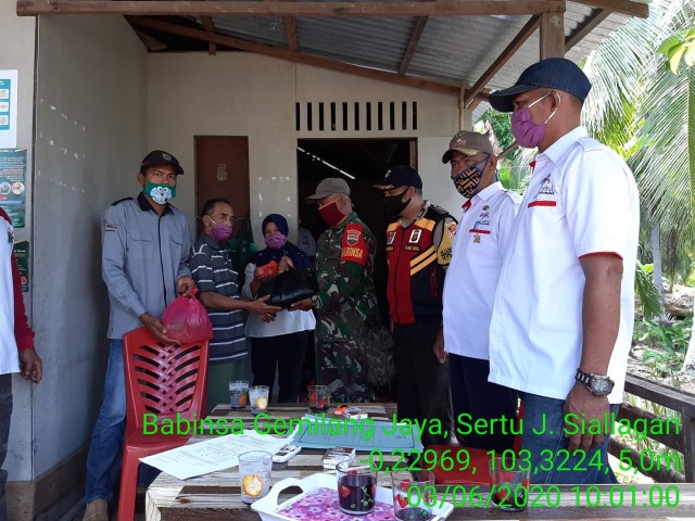 Turut mengikuti kegiatan pembagian sembako Kepala Desa Sialang Jaya, Rusdi beserta staf desa dan Babinsa Koramil 12/Batang Tuaka diwakili oleh Sertu J Siallagan.