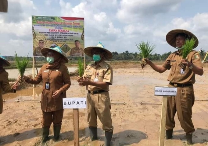 Bupati Kuantan Singingi Drs.H.Mursini, M.Si mengikuti acara tanam perdana kegiatan perbaikan mutu intensifikasi (PMI) dihamparan sawah seluas 136 Ha desa teberau panjang sekaligus gerakan bersama tanam penyediaan pangan daerah, Selasa (30/6/2020)