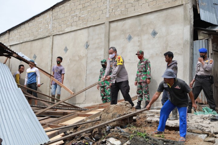 Indragirione.com,- Kapolres Inhil, AKBP Indra Duaman Siahaan, SIK turun langsung membantu membersihkan puing-puing dan menyalurkan bantuan bagi korban bencana tanah longsor di Kelurahan Seberang Tembilahan, Kecamatan Tembilahan, Sabtu (11/7/2020) pagi.