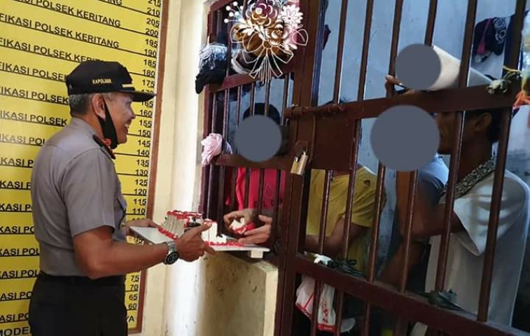Tampak dalam foto yang di unggah Kapolsek Keritang, AKP Martunus di akun facebooknya dengan tersenyum ramah membagikan kue HUT Bhayangkara ke-74 ke seluruh para tahanannya.