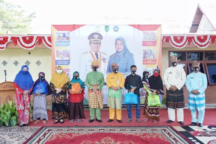 Usai Sambutan dilanjutkan dengan penyerahan bantuan Kepada perempuan dan anak-anak yang terdampak Covid-19 sekaligus pemasangan masker secara simbolis oleh Bupati HM.Wardan dan Ketua TP PKK Inhil Hj.Zulaikhah Wardan.
