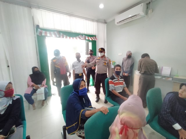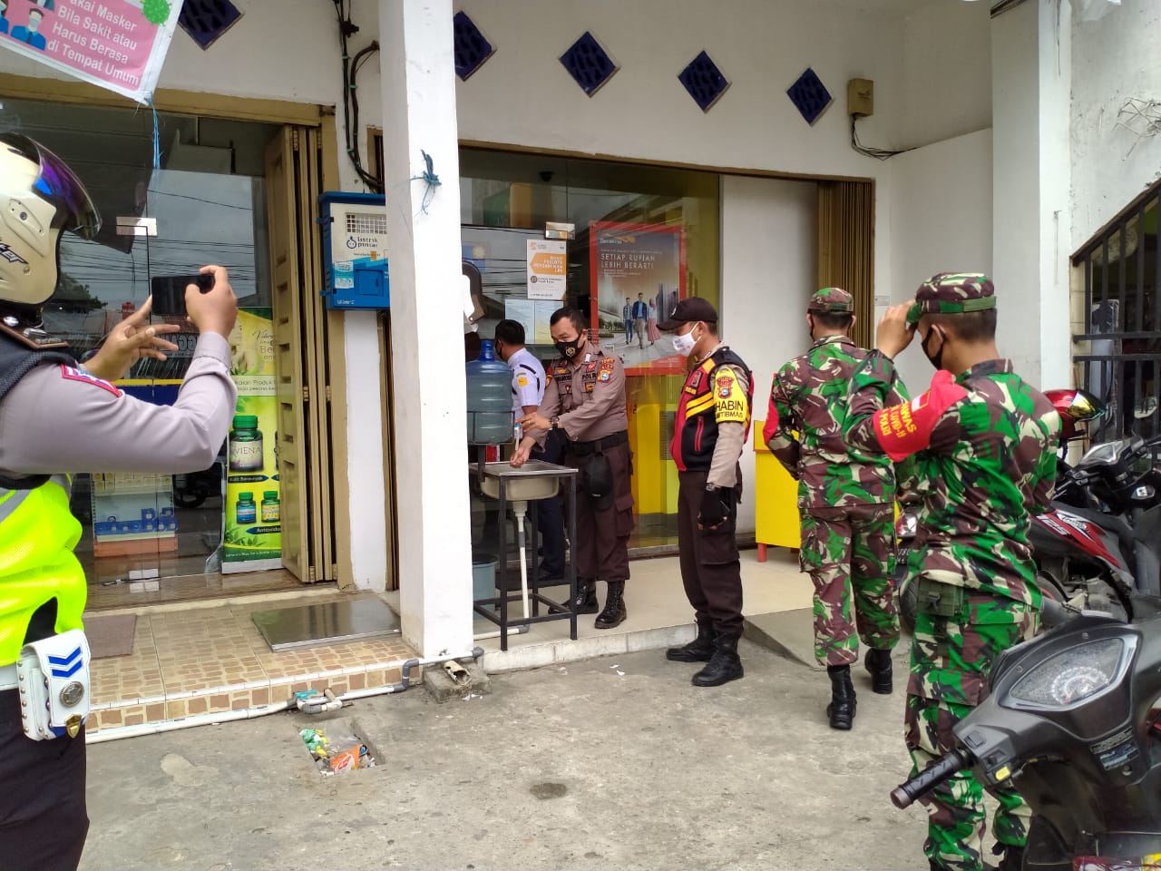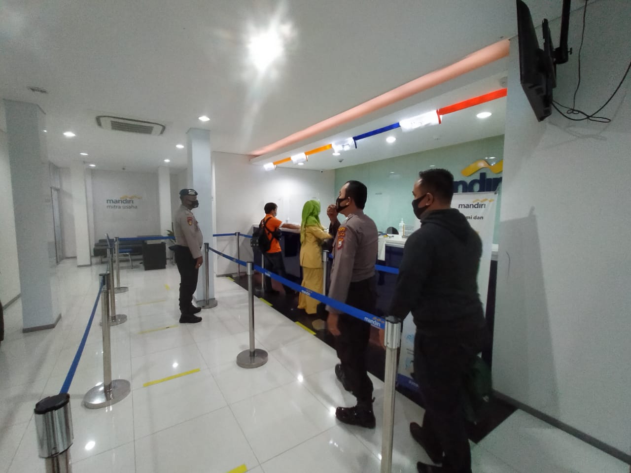 Polisi juga mengecek penerapan protokol kesehatan di fasilitas umum untuk memastikan agar para tamu yang ada menjaga jarak aman saat antre menunggu.