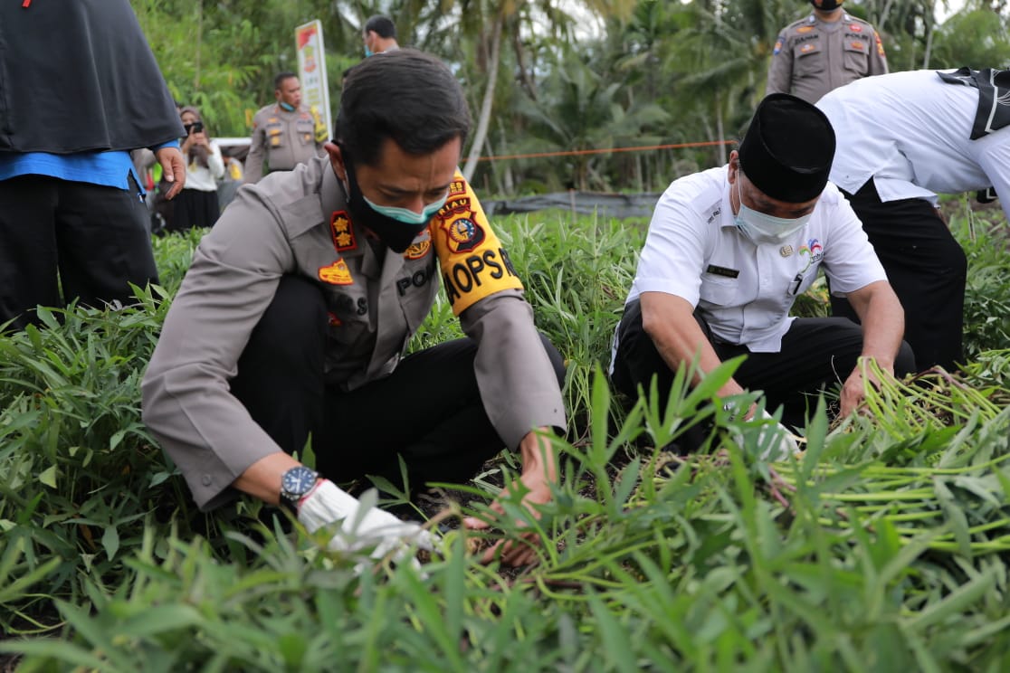 Kapolres Inhil AKBP Dian Setyawan sambil memanen ubi jalar, mengapresiasi kegiatan positif yang diprakarsai oleh Kapolsek Tembilahan Hulu AKP Rhino Handoyo dan kelompok tani Makmur Sejahtera.