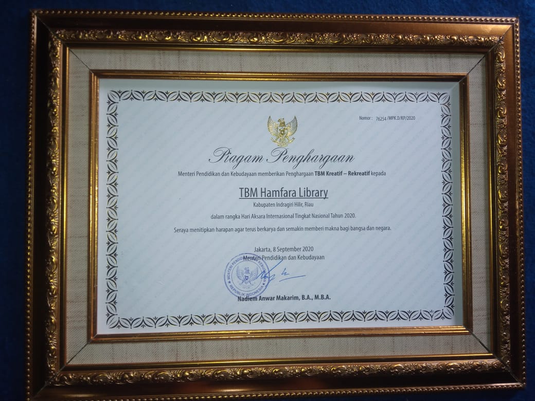 Indragirione.com,- Tembilahan Hulu (2/10/2020), TBM Hamfara Library mendapatkan penghargaan dari Menteri Pendidikan dan Kebudayaan (Mendikbud) Republik Indonesia, bapak Nadiem Anwar Makarim.