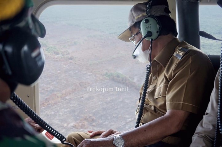 Pakai Helikopter, Bupati Inhil Pantau Karlahut Lewat Udara
