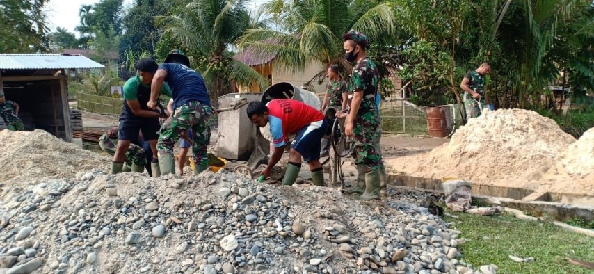 Satgas TMMD bersama dengan masyarakat terus berjibaku dan mengejar waktu untuk pelaksanaan pengecoran, dikarenakan hari jumat merupakan waktu yang singkat.