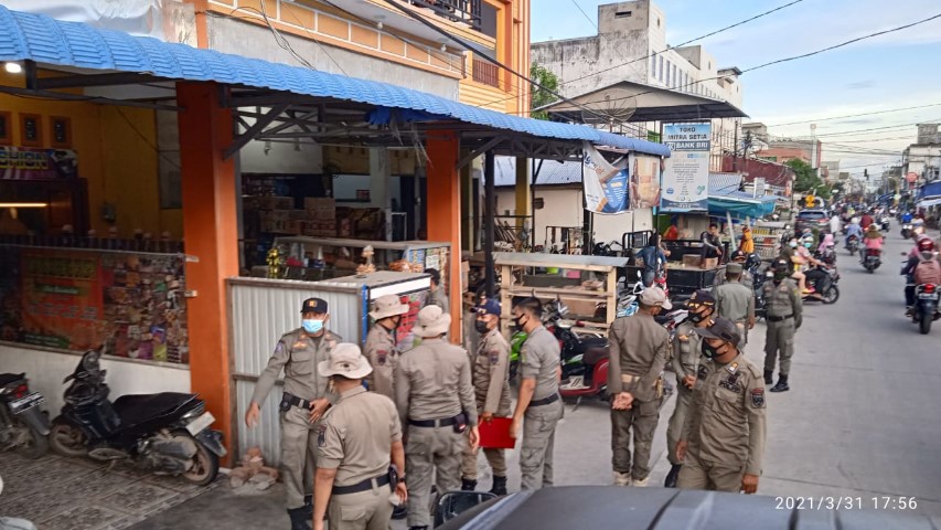 Indragirione.com,- Satuan Polisi Pamong Praja (Satpol PP) Kabupaten Inhil menertibkan puluhan pedagang kaki lima (PKL) yang berjualan di badan dan trotoar Jalan Batang Tuaka, Rabu (31/3/2021).
