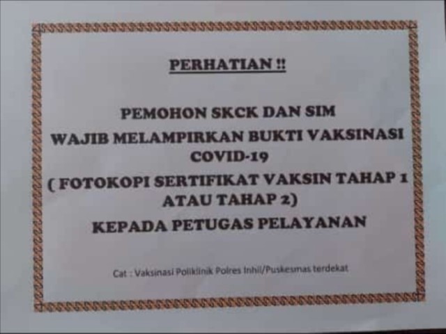 Indragirione.com,- Dalam kepengurusan pembuatan Surat Keterangan Catatan Polisi (SKCK) dan Surat Izin Mengemudi (SIM) di Polres Indragiri Hilir (Inhil) dan jajaran kini mewajibkan masyarakat untuk menyertakan bukti telah melakukan vaksinasi COVID-19 sebagai salah satu syarat.