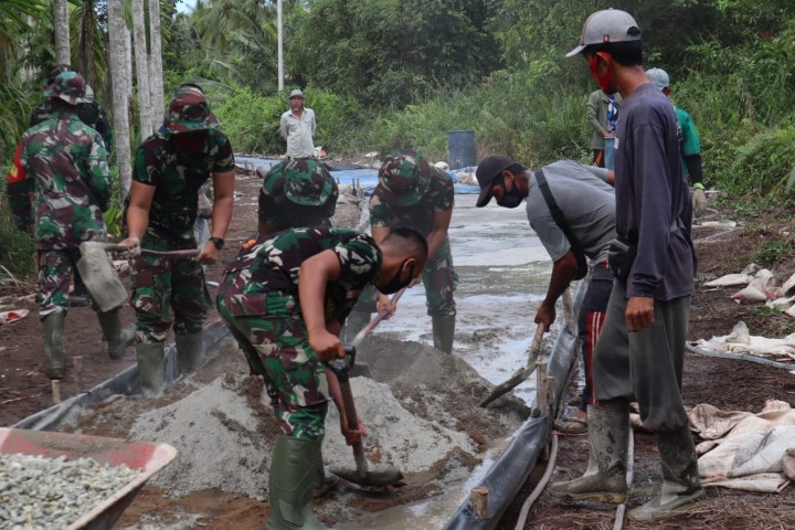 TNI Manunggal Membangun Desa Ke 111 Kodim 0314/Inhil Semenisasi Jalan Penghubung Antara Desa Teluk Bunian Menuju Desa Terusan Bringin Jaya