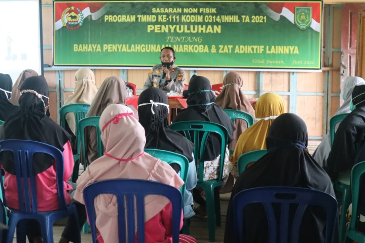 Bertempat di Sekolah SMP Negeri Satu Atap Teluk Bunian, Kapolsek Pelangiran Iptu Andi Ace SH di suasana sasaran Non Fisik dalam Tugas TMMD ke 111 TA 2021 sebagai wujut program TNI AD mengingatkan seluruh masyarakat atas bahaya penggunaan Narkoba dan zat adektif