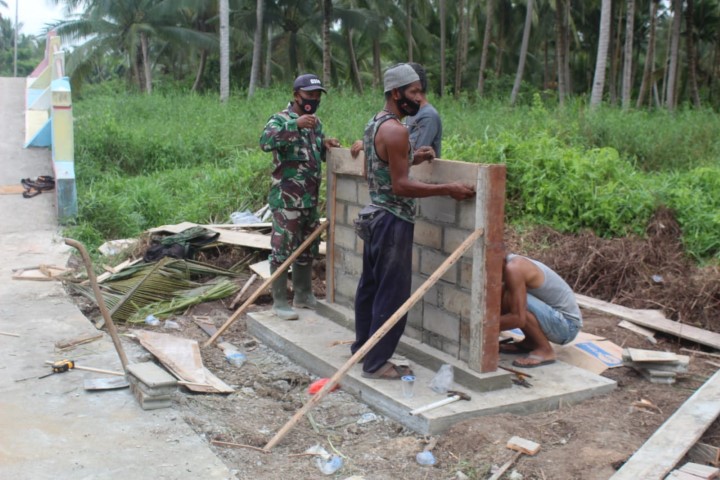 Indragiri Hilir, - Tidak hanya masyarakatnya saja yang ikut bergotong royong, Kepala Desa Teluk Bunian hari ini ikut turun tangan dalam pengerjaan pembuatan tugu prasasti TMMD ke 111 Kodim 0314/lnhil. Senin, (05/07/2021).
