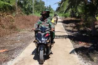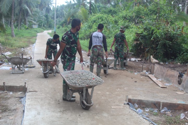 "Untuk itu, hari ini anggota Satgas saya bagi 3 kelompok. Sebagian di lokasi sasaran untuk membuat adukan dan semenisasi, sebagian membuat mal pembatas jalan dan sebagian lagi melansir bahan atau material berupa pasir, batu kerikil dan pasir dari lokasi penyimpanan bahan bangunan ke lokasi semenisasi," paparnya.