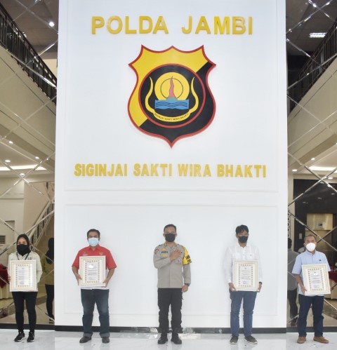Penyerahan penghargaan berlangsung di lobby Gedung Utama Polda Jambi, Rabu (7/7/2021), dilakukan oleh Kapolda Jambi Irjen Pol Albertus Rachmad Wibowo, Wakapolda Brigjen Pol Yudawan R, Irwasda Kombes Pol Dwi Gunawan, dan Karo Ops Kombes Pol Feri Handoko.