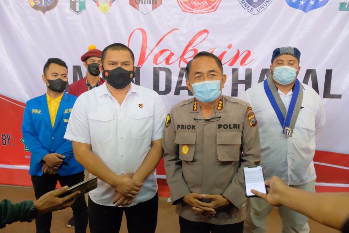 Kabid Dokkes Polda Riau Kombes dr Prio Kuncoro didampingi Direktur Kriminal Umum Kombes Teddy Ristiawan kepada media mengatakan pihaknya sedang menyelenggarakan Vaksinasi yang digagasan Kapolda Riau dengan menggandeng organisasi kemahasiswaan.