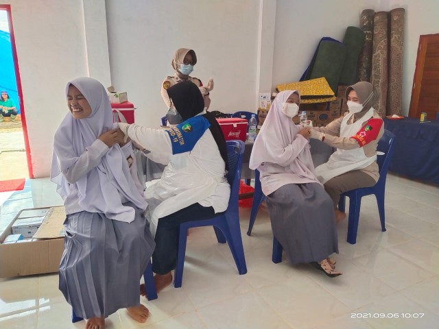 INHIL,- Vaksinator Urkes Polres Inhil melaksanakan kegiatan vaksinasi Covid-19 tahap pertama bagi santri pondok Pesantren Darul Rahman secara gratis, pada Senin (6/9/2021)