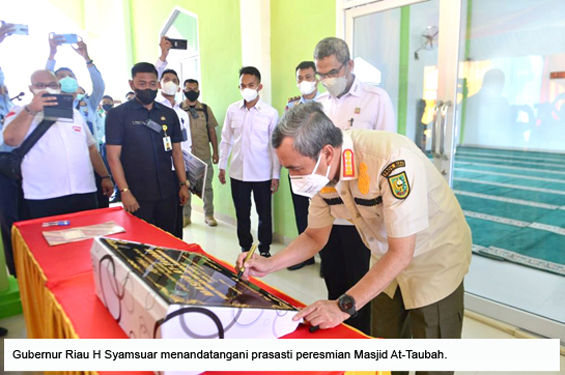 Gubernur Riau (Gubri) H Syamsuar menghadiri peresmian Mesjid At-Taubah yang berada di kawasan Lapas Narkotika, Rumbai Pekanbaru, Senin (19/10/2021). Dalam sambutannya, Gubri menyampaikan sejarah didirikannya Mesjid At-Taubah, yang merupakan amanah dari Menkumham RI, Yasonna H Laoly. Saat itu, Lapas Narkotika Rumbai menjadi tempat hunian sementara warga binaan Rutan Kelas IIB Siak yang bangunannya habis terbakar, karena adanya kerusuhan.