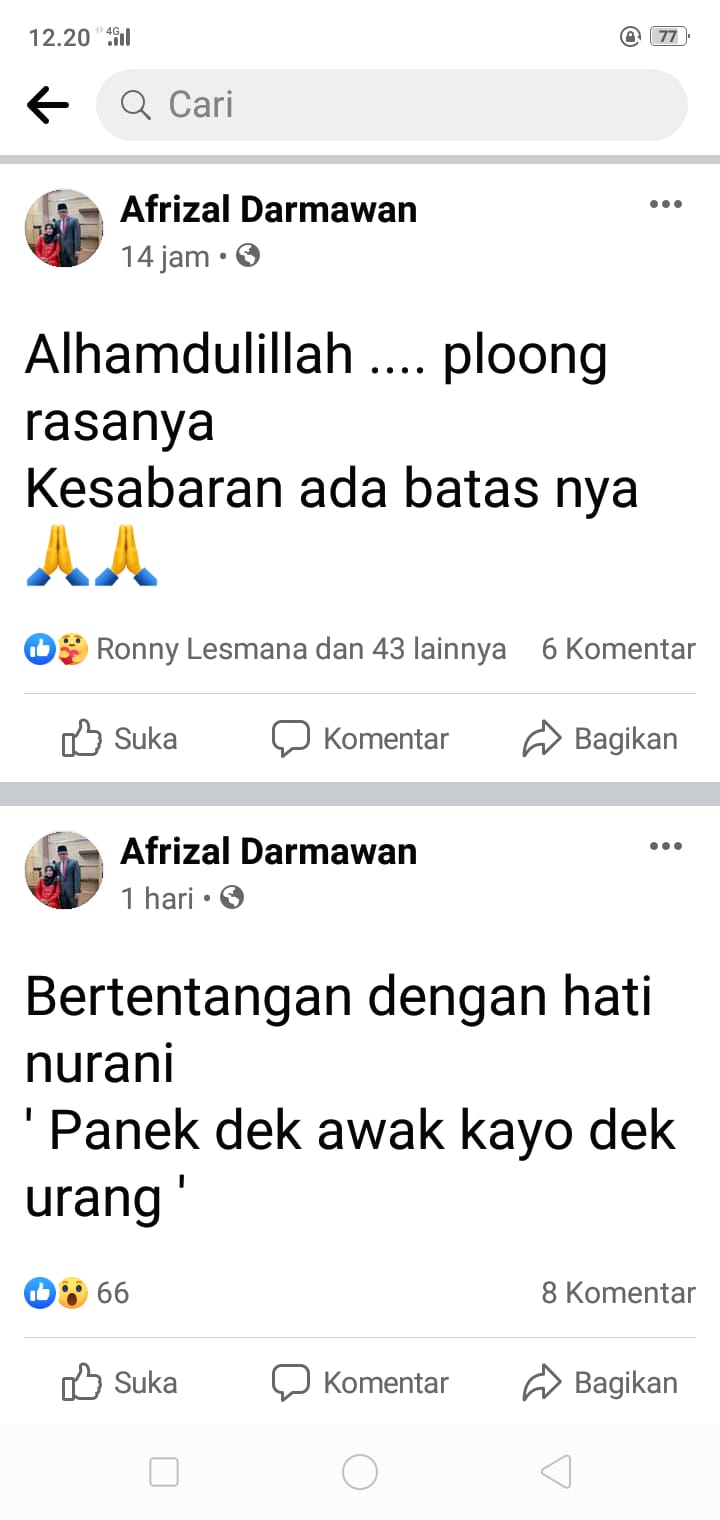 Bahkan akun Facebook dari dr. Afrizal Darmawan membuat dua buah status dalam waktu yang berbeda, yang diduga curahan hatinya memutuskan untuk mengundurkan diri dari Kepala Dinkes Inhil.