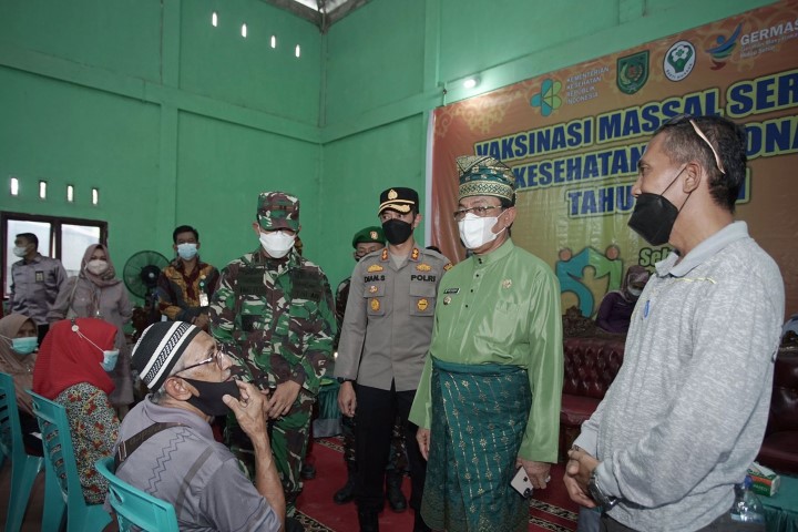 Vaksinansi massal yang dilaksanakan ini ditinjau lansung Bupati HM.Wardan melaksanakan Vaksinasi massal secara serentak yang dipusatkan di Gedung serba guna Tuah Negeri Desa Mumpa, Jum'at (12/11/2021) pagi.