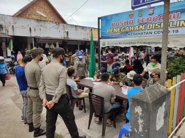 INHIL,- Tim Yustisi penanganan protokol kesehatan Kabupaten Indragiri Hilir melaksanakan operasi yustisi dan sidang ditempat di Pasar Pagi Jalan Baharuddin Yusuf Tembilahan, Kecamatan Tembilahan, Rabu (3/11/2021).