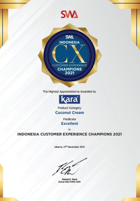 Indragirione.com, - Di penghujung tahun 2021, KARA kembali menorehkan prestasi dengan mendapatkan predikat Excellent untuk kategori Coconut Cream dalam ajang Indonesia Customer Experience Award 2021. Pemberian penghargaan dilakukan secara daring pada Selasa, 21 Desember 2021.