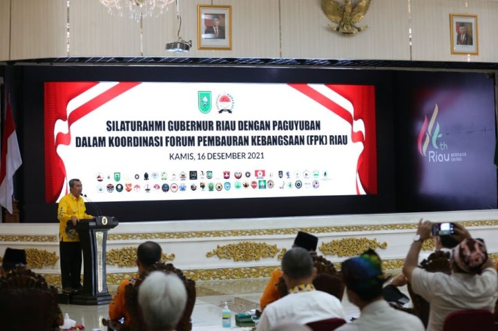 Hal ini disampaikan Gubri saat bersilaturahmi dengan paguyuban yang tergabung dalam Forum Pembauran Kebangsaan (FPK) Provinsi Riau di Gedung Daerah Balai Serindit, Kamis (16/12/2021). Pada pertemuan itu, Gubri mengharapkan kerjasama paguyuban di Riau untuk mensukseskan program vaksinasi di Riau.