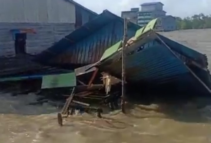 INHIL,- Akibat air pasang dan gelombang tinggi disertai angin kencang, salah satu rumah yang ada di Desa Panglima Raja, Kecamatan Concong, Kabupaten Inhil ambruk.