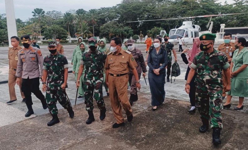 Danrem 031/Wira Bima Brigjen TNI M. Syech Ismed, S.S., M.Han beserta rombongan disambut langsung oleh Bupati Inhil H. Muhammad Wardan, Ketua DPRD Kab. Inhil serta unsur Forkopimda. Mendarat di halaman Kantor Bupati Inhil, rombongan langsung menuju ke Makodim 0314 Inhil.