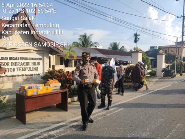 INHIL,- Bertempat di depan Mapolsek Jalan Propinsi Kelurahan Sungai Salak, Kecamatan Tempuling Kabupaten Inhil, Polsek Tempuling melaksanakan kegiatan pembagian takjil kepada masyarakat yang melintas, Jumat (8/4/2022).
