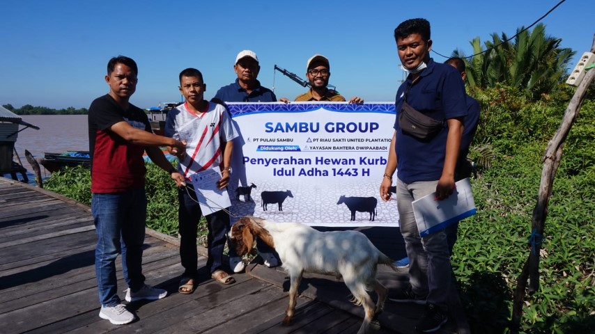 Indragirione.com, - Mengulangi tradisi yang sudah berjalan selama ini dalam menyambut Idul Adha 1443 H Sambu Group menyalurkan hewan kurban disekitar wilayah operasional perusahaan di Indragiri Hilir meliputi Kec. Pulau Burung, Kec. Kateman, Kec. Tanah Merah dan Tembilahan. Tahun ini Sambu Group menyalurkan hewan kurban berupa sapi sebanyak 6 ekor dan kambing sebanyak 14 ekor.