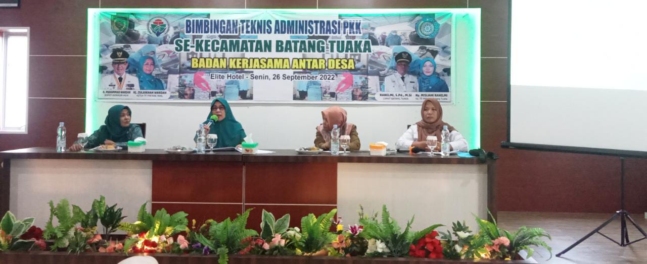 Indragirione.com, - Ketua Tim Penggerak (TP) Pemberdayaan dan Kesejahteraan Keluarga (PKK) Kabupaten Indragiri Hilir (Inhil) Hj. Zulaikhah Wardan hadiri pelaksanaan Bimbingan Teknik (Bimtek) administrasi PKK Se-Kecamatan Batang Tuaka bekerja sama dengan Badan Kerjasama Antar Desa (BKAD) dan tekankan Stunting Inhil, kegiatan dilaksanakan di Hotel Elite, Jl H Sa'id Tembilahan, Senin (26/09/2022).