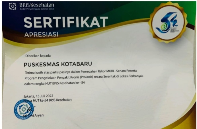 Sehingga kegiatan Senam Prolanis peringatan HUT ke-54 tahun 2022, mendapat Rekor Muri dengan Peserta Terbanyak.