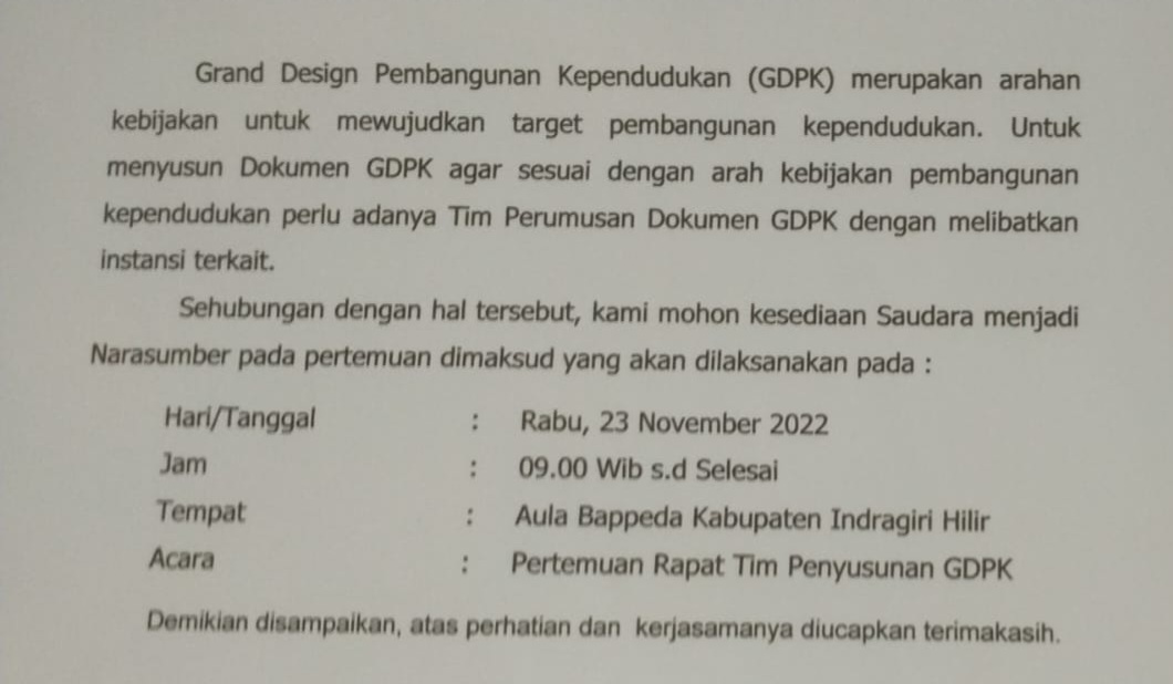 "GDPK merupakan arahan kebijakan untuk mewujudkan target pembangunan kependudukan," tulis isi surat yang ditandatangani oleh Kepala DP2KBP3A Inhil R Arliansyah.