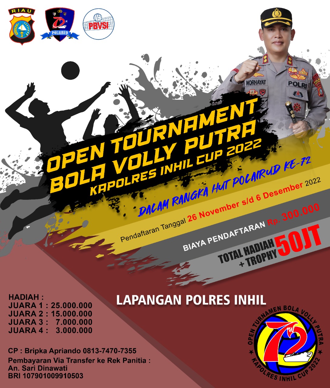 la menyebutkan pendaftaran turnamen bola voli Kapolres Inhil Cup tahun 2022 telah dibuka mulai hari ini.