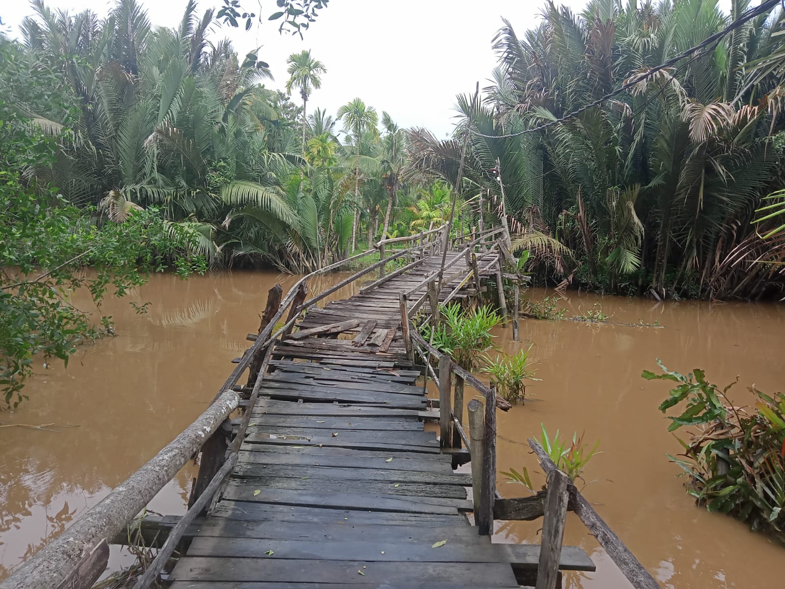Jembatan dengan tiang penyangga dari kayu yang sudah lapun terkena air banjir sudah tak sempurna lagi. Papan-papan sebagai alas pijakan jembatan sudah banyak yang lapuk dan hilang.