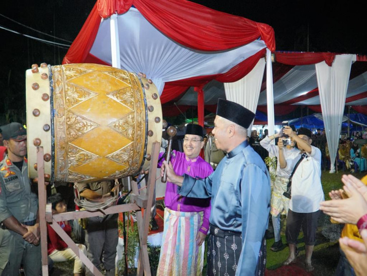 INDRAGIRIONE.COM, RUMBIO JAYA - Musabaqah Tilawatil Quran (MTQ) ke-52 Tingkat Kabupaten Kampar tahun 2023 resmi dibuka secara langsung oleh Pj Bupati Kampar Dr H Kamsol MM, Senin malam (13/3/2023). Pembukaan yang ditandai dengan pemukulan bedug dan diiringi dengan Mars Gema Qurani, dihiasi kembang api yang memancarkan warna warni di langit lapangan Pulau Payung.