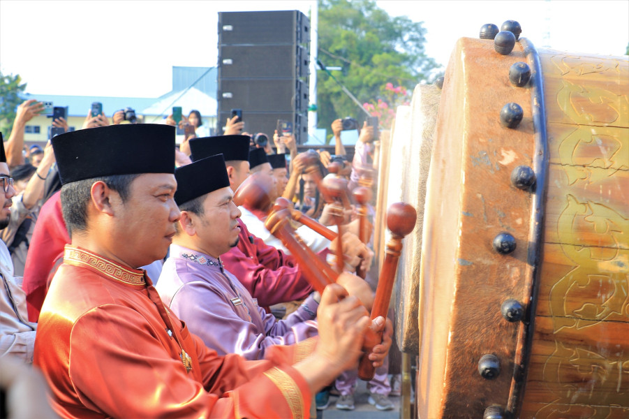 INDRAGIRIONE.COM, PEKANBARU - Penjabat (Pj) Walikota Pekanbaru Muflihun, melakukan pemukulan beduk bersama unsur Forkopimda sebagai tanda dibukanya Petang Belimau, Rabu (22/03/2023). Ia menyebut bahwa tradisi Petang Belimau digelar satu hari sebelum memasuki bulan suci Ramadan.