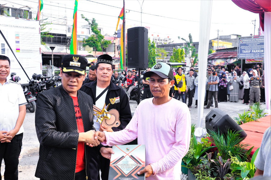 INDRAGIRIONE.COM, PEKANBARU - Penjabat (Pj) Walikota Pekanbaru Muflihun SSTP MAP secara resmi menyerahkan kios tempat penampungan sementara (TPS) kepada para pedagang di Pasar Cik Puan Pekanbaru, Sabtu (29/04/2023). Dengan demikian, para pedagang sudah bisa kembali berjualan di kios yang telah disediakan Pemerintah Kota Pekanbaru tersebut.