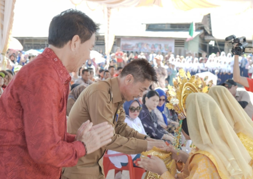 Bupati Rokan Hilir Afrizal Sintong didampingi salah satu donatur Koping Ho, melaksanakan gunting pita sekaligus menandatangani prasasti dalam rangka meresmikan penggunaan pembangunan jalan utama di Pulau Halang Kecamatan Kubu Babussalam, Senin (5/6/2023).