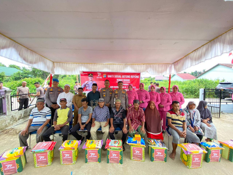 INHIL,- Polres Indragiri Hilir (Inhil) melaksanakan kegiatan bakti sosial gotong royong di Masjid dan rumah ibadah serta memberikan Bantuan sosial (Bansos) berupa sembako terhadap masyarakat kurang mampu dalam rangka Hari Bhayangkara Ke-77 tahun 2023.