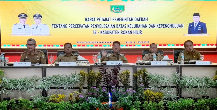 Bupati Rohil Afrizal Sintong ketika membuka Rapat Pejabat Pemda Rohil Tentang Percepatan Penyelesaian Batas Kelurahan, dan Kepenghuluan se Kabupaten Rokan Hilir (Rohil), Senin (24/7/2023) mengatakan penetapan melalui Perbup agar dapat segera selesai.