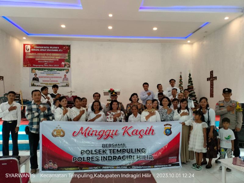 Inhil,- Kapolsek Tempuling AKP Osben Samosir menyampaikan imbauan Kamtibmas kepada Jemaat Gereja Pantekosta di Indonesia (GPdI) Imanuel Blok D RT. 022 RW. 06 Dusun Indra Jaya, Desa Karya Tunas Jaya, Minggu (1/10/2023) melalui program Minggu Kasih.