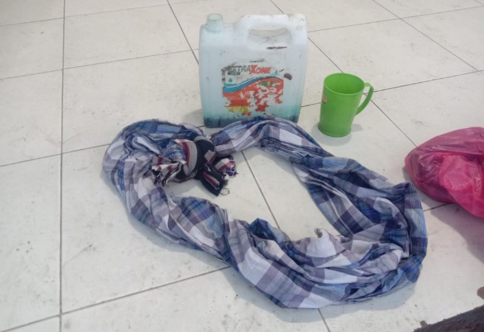 "Kami melakukan olah TKP dan visum. Hasilnya leher korban mengalami luka bekas gantung diri, di tubuh korban tidak terdapat tanda tanda kekerasan. Mulut dan hidung korban mengeluarkan cairan warna hijau, korban juga mengeluarkan kotoran. Di lokasi juga kami temukan gelas warna hijau sisa racun rumput yang telah diminum korban," jelasnya.