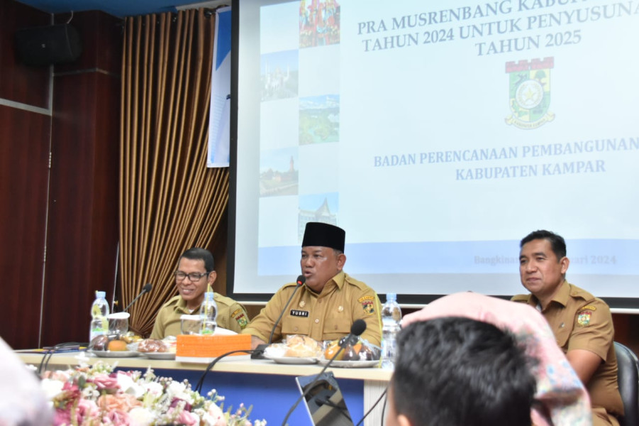 INDRAGIRIONE.COM, BANGKINANG - Pj Sekda Kampar Drs Yusri MSi pimpin rapat pra Musrenbang 2024 dan penyusunan RKPD 2025 yang berlangsung di ruang aula Muara Takus Kantor Bappeda Kabupaten Kampar, Senin (19/02/2024).